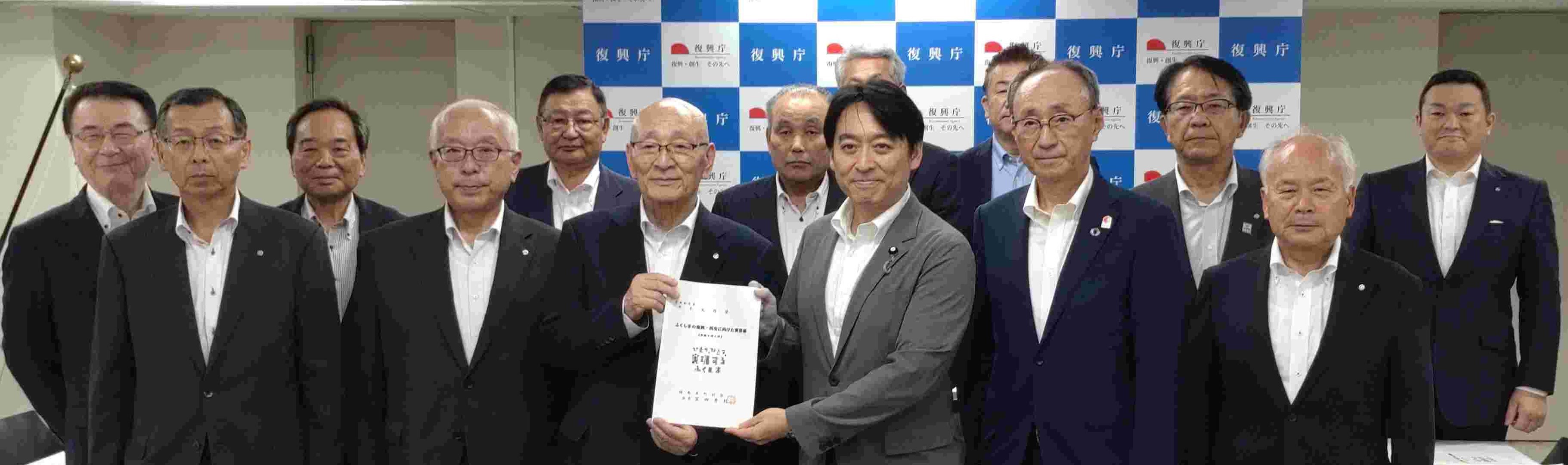 | 6.7.23 | 定期総会で採択された「ふくしまの復興・再生に向けた特別決議」に基づく要請活動を、宮田秀利会長ほか本会役員により実施した。 要請では、復興庁、自民党及び本県関係国会議員に対し、ふくしまの復興・再生に向け、山積する諸課題の解決について強く要請した。 →■ふくしまの復興・再生に向けた要請書(PDF) 【要請先】 〇復興大臣 〇自由民主党東日本大震災復興加速化本部長 〇本県関係国会議員 【要請の様子】