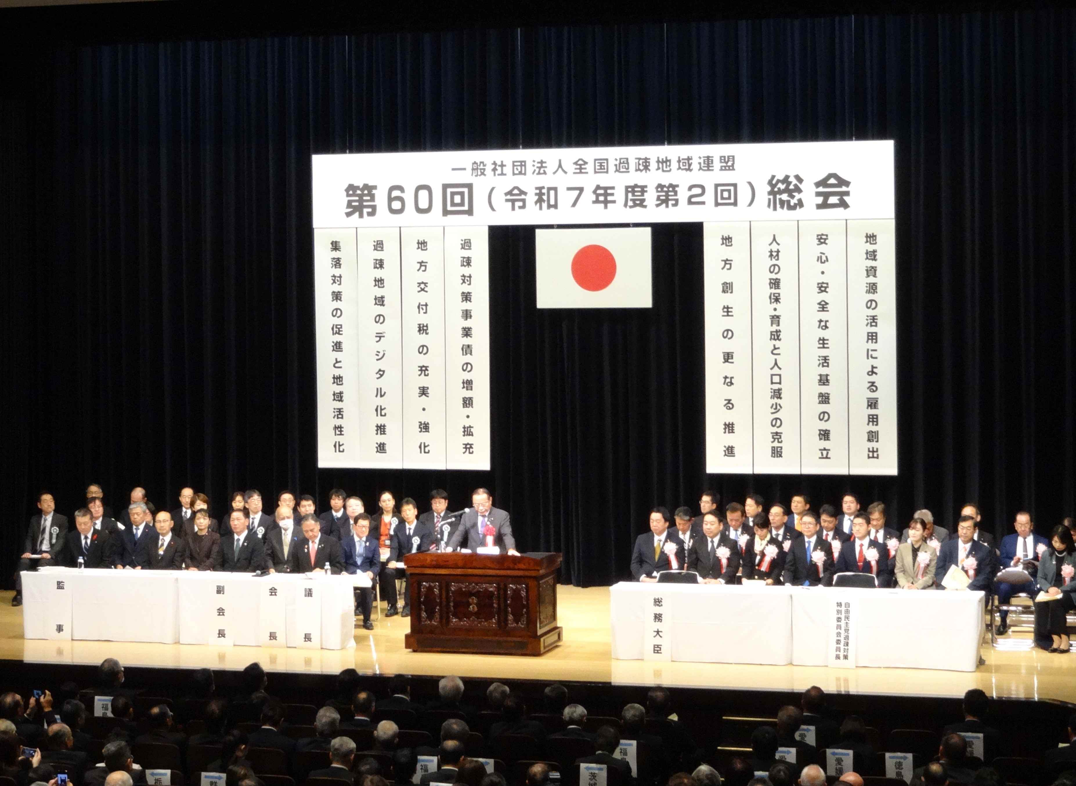 全国過疎地域連盟の定期総会が開催され、県内の過疎地域に指定されている市町村長並びに議長が出席した。