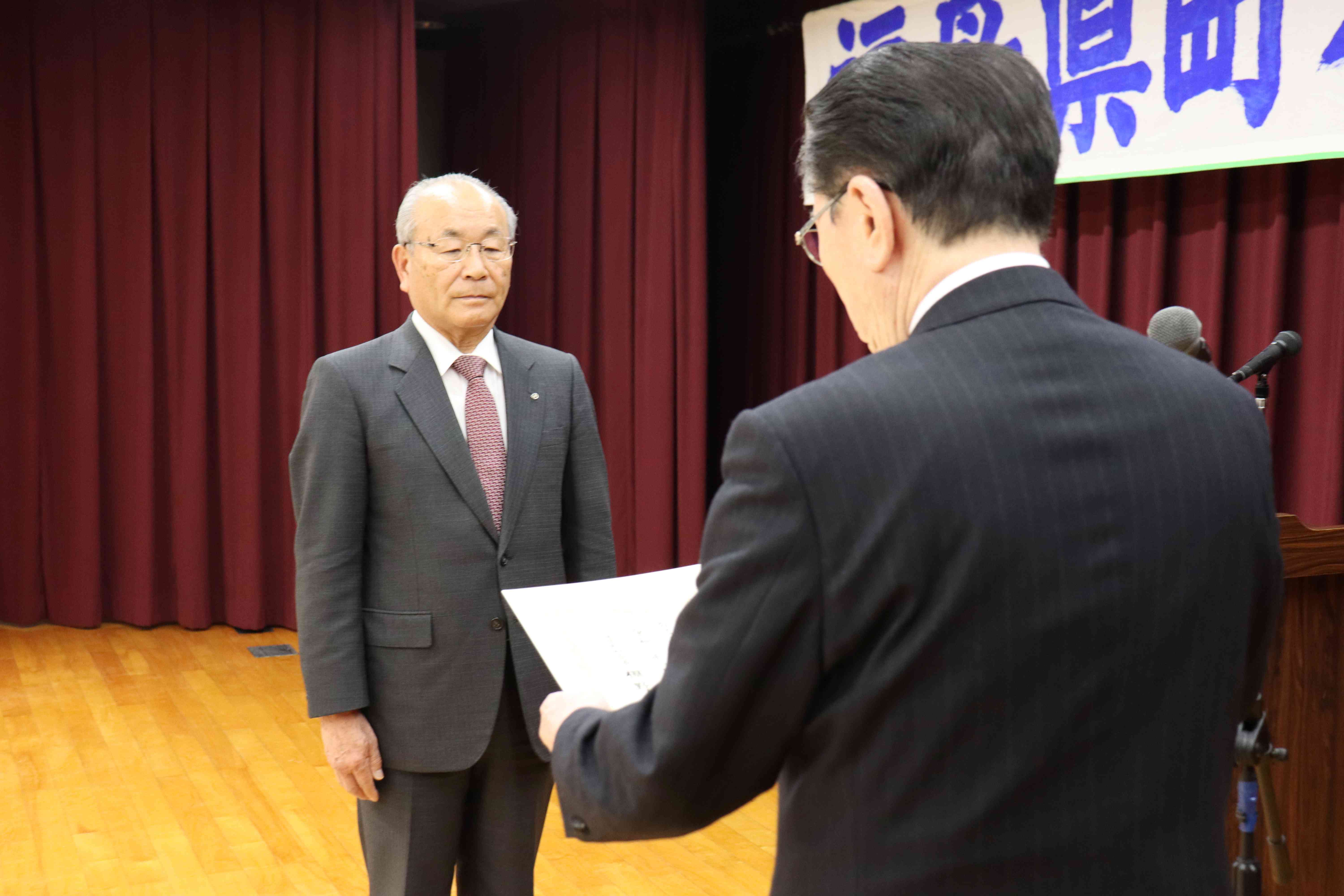 総会は、舟木幸一副会長(昭和村長)の開会の言葉ではじまり、宮田秀利会長(塙町長)の挨拶の後、本会表彰規程による優良町村の 石川郡 古殿町と、自治功労者の双葉郡 葛尾村長 篠木 弘 氏ほか91名を表彰した。